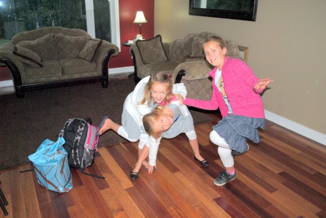 And welcome to kindergarten my little princess. Poor little Kylie. She wiped out on the playground at recess on her first day so her big cousin took her to the office to get a bandaid for her knee. The office then fixed her up and sent her back outside, but recess was over and everyone was back in their classes. Turns out once you are outside, the doors lock and you can't get back in. So Kylie was stuck crying on the steps until the teacher found her. Big sister Hayley says "Come on Kylie you should have just played on the playground. Thats what I would have done." And it is exactly what Hayley would have done too!!